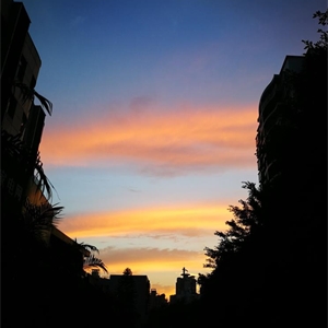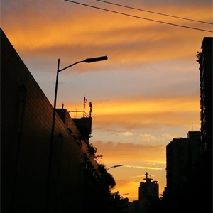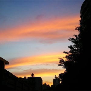 霞彩自日暮而生,如金织丝锦。红云似火焰、似鲜血、似玫瑰、似胭脂,黄云似金子、似麦穗、似秋阳、似柠檬。辉煌的色彩在高而深远的墨蓝天空上尤为亮丽,如同水面上谁落下了几条五彩的缎子。转瞬即逝的美丽,在黄昏的生死轮回之时,仿佛被定格,永不消失。