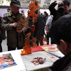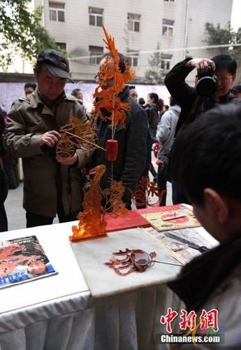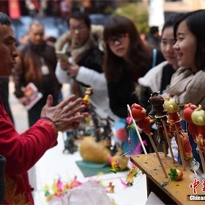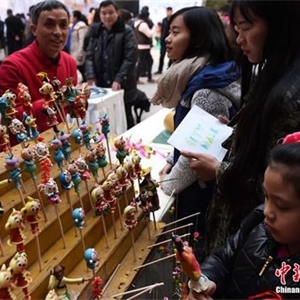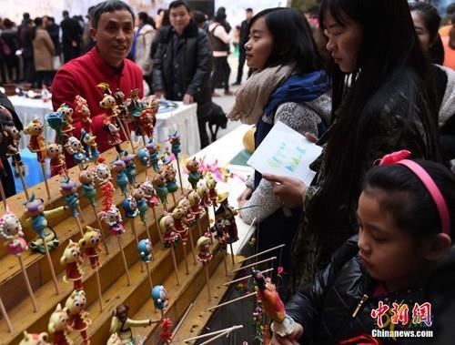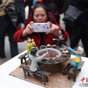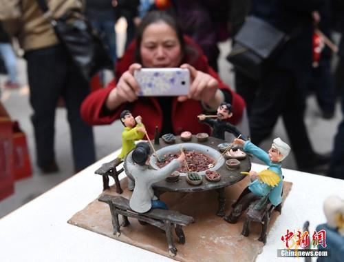 2月18日,糖画、棉花糖、龙须酥、糖糍粑、打麻糖等老重庆的舌尖记忆一一亮相重庆“十八梯?老重庆”文化节。现场,不仅有童年时期的小食供市民品尝找回忆,还有面人、糖人、蜀绣等非物质文化遗产传人现场展示技艺。图为非遗传人用做糯米和食用色素手捏而成的“吃火锅”场景图吸引市民拍照留念。