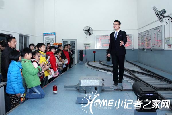 在轨道交通信号实训室里,讲解员在正为小记者介绍轨道的区别