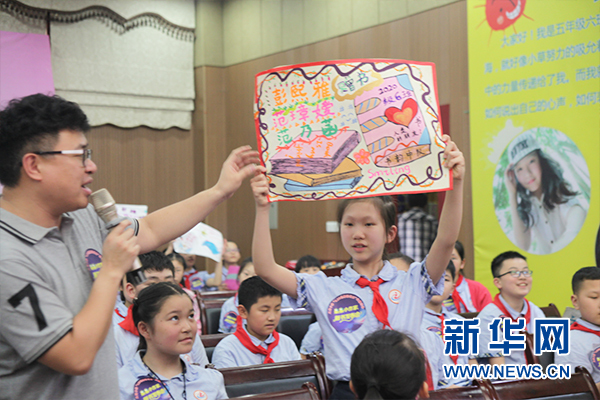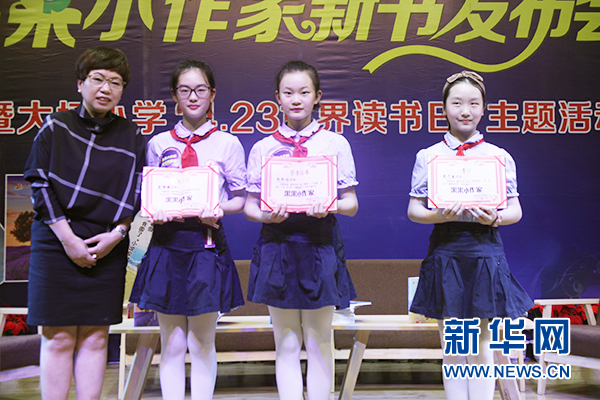 三位小作家向同学们进行签名赠书。新华网发(范成成 摄)