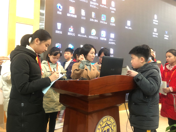 在校园记者团老师的带领下,小记者们深入到活动现场,认真听讲座,用手里的笔捕捉记录现场细节,并在活动现场,每组分别针对自己所要采访的对象进行了采访。