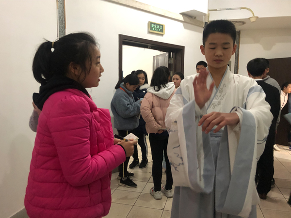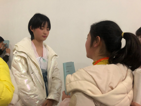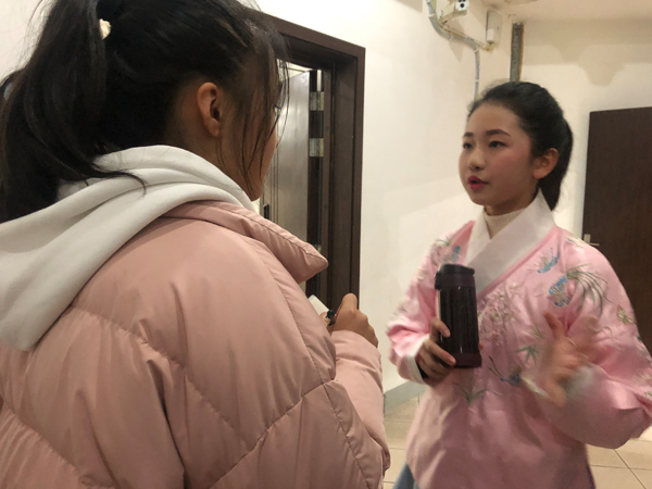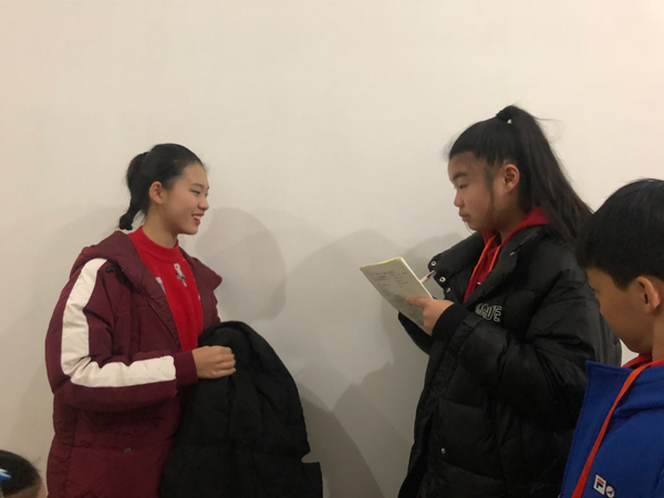 小记者陈思羽对表演者进行了采访,“请问你们班为什么要表演唐朝盛世呢?”“请问你在演唱中觉得哪一部分最困难?”另一边,小记者蒋林洁采访了某班负责统筹的同学,“对于本次比赛有什么感想呢?在整个准备的过程中遇到了哪些难题?”小记者肖尧对观众进行了采访,“请问你看完他们的表演,哪个节目让你印象比较深刻呢?”