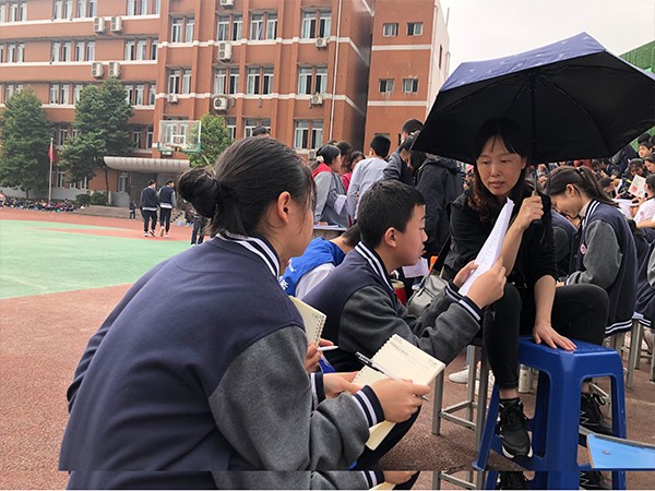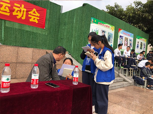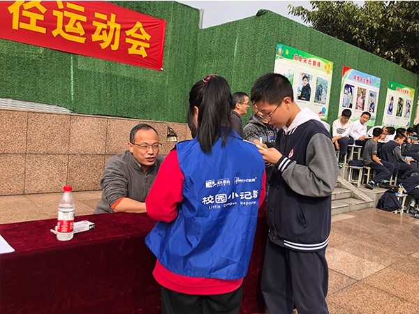 小记者唐欣悦对初2021级1班的班主任老师进行了采访,“请问您对本班孩子运动会的表现觉得怎么样?”“现场最让您印象深刻有哪些?”另一边,小记者周淼采访了王校长,“针对本次运动会,校长有什么想对同学们说的呢?”王校长表示:“希望同学们能发挥奥运精彩,赛出精彩赛出水平,友谊第一比赛第二......”小记者晏徐飞他们组则深入到比赛现场,针对比赛同学进行了不同的提问,整个过程组织有序。