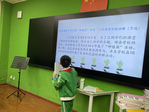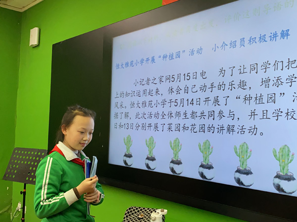课堂主体:课堂上通过阅读一则新闻导语材料,分析了导语中新闻六要素体现了哪几个要素,并让小记者们从读者角度进行分析评价,他们认为对于“种植园”的报道导语该如何写,提出了自己的想法构思。随后小记者们根据自己的构思对材料中得到与进行了改写,小记者们积极发言分享自己的观点。