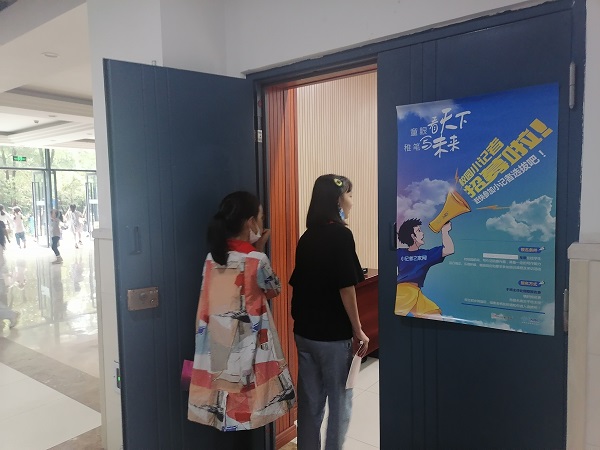9月18日当天,选拔校园小记者的老师提前来到现场,通过张贴海报、放映招募PPT的方式,营造面试氛围,引导学生进入现场。