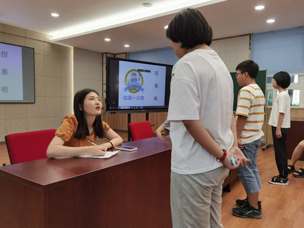 9月22日当天,选拔校园小记者的老师提前来到现场,通过张贴海报、放映招募PPT的方式,营造面试氛围,引导学生进入现场。