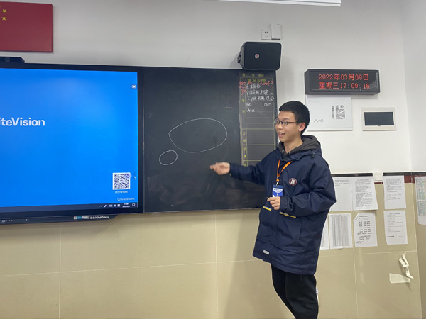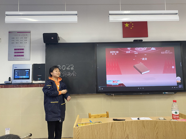 课前分享环节是由初二1班的唐睿涵和舒梓洋同学进行的,唐睿涵从当下时事热点2022全国两会进行了分析并为其他小记者们普及了相关知识。首先,2022全国两会指的是中华人民共和国第十三届全国人民代表大会第五次会议和中国人民政治协商会议第十三届全国委员会第五次会议。随后她还从贴近学生生活的话题入手,引入了“剧本杀”提倡正能量的提案和新东方俞敏洪提出的相关观点进行了分析,小记者们都觉得收获满满。