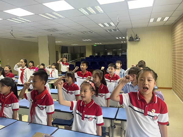 “我是重庆市渝北区笃信实验小学的学生,我自愿加入小记者队伍......”在本节课的最后,小记者社团举行了成团宣誓仪式,小记者们充满斗志地进行了宣誓,愿他们能做一个“校园的发现者、梦想的记录者、文化的传播者”。