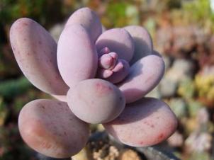 桃美人茎短且粗,叶肉质,排列呈延长的莲座状,呈倒卵形,先端平滑钝圆,有轻微的钝尖。叶片表面覆盖白粉,衬托叶片的粉红色,看起来植株呈现漂亮的淡紫或淡粉色,非常可爱。很多人的窗台客厅都有栽培,我的家里也有一盆可爱的桃美人。