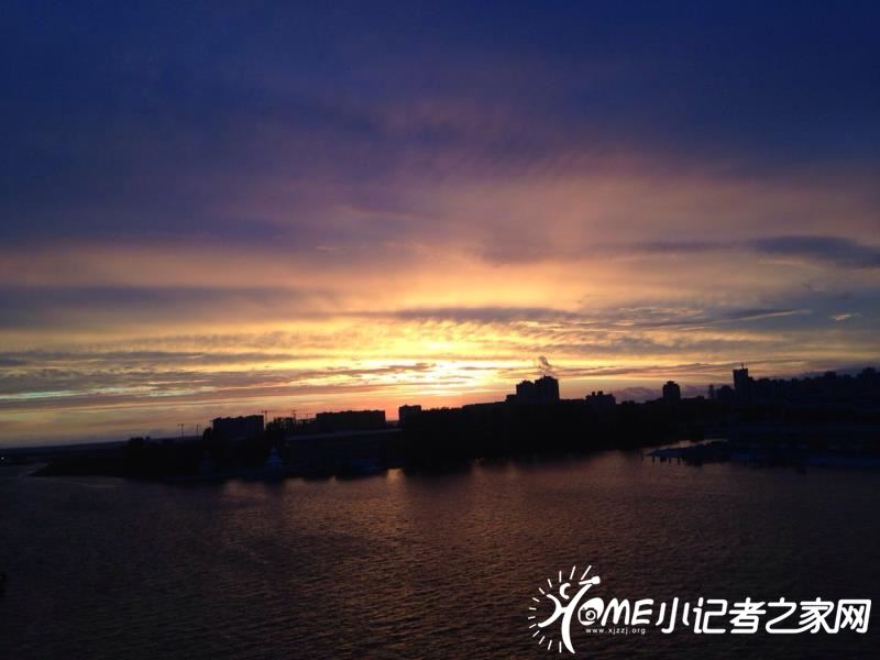 太阳在地平线上停留着,强烈的光线随着海面的反射照来,这强光照得一部分海面什么也看不见,仿佛海面被刺眼的光包裹着。天空万里无云,晕染着太阳的绯红,那天空的颜色也是层层递进,由内至外的霞色最后变成泛点儿金光的银色,犹如彩云追月。