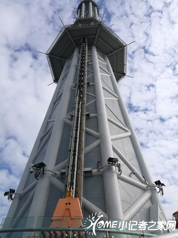 我和妈妈乘坐快速电梯来到450米的塔顶平台,先去体验“极速云霄”。当我们坐在座椅上缓缓升到最高点,座位突然极速下坠,我的心里咯噔一下,而坐在旁边的妈妈已经尖叫了起来,失重的感觉真是太刺激了!