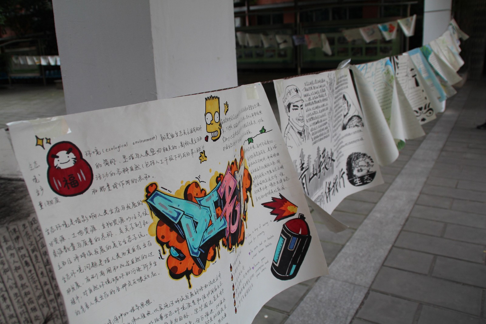 高一和高二年级之间的走廊,展示了手抄报比赛的参赛作品