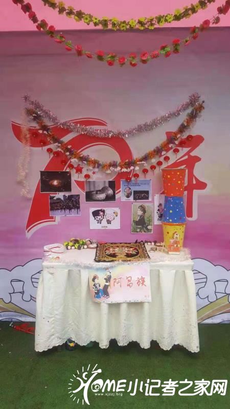 除了入场式展示,每个班还布置了特色展台。每个班的展台都是根据自己班民族的文化习俗来布置的,充满了民族气息。展台上都摆满了精致的展品。有刺绣,有雕刻,有模型,还有各民族的服装娃娃。这些展品可不普通,他们有的是四处搜罗来的,有的是同学们自己动手做的。