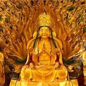 大佛湾的佛像众多,其中,最吸引游客的还是要数金碧辉煌的千手观音像了。这尊千手观音像高7.7米,宽12.5米,安详地端坐在宝座上,双手合十,面带微笑,表情微妙,让人难以琢磨透。她的身后有1007只金手,每只手上都有一只眼,拿有一个法器,呈孔雀开屏状。千手观音身上颜色众多,以金色为主,宝蓝色、红色为辅。而且用了150万张金箔贴在手和身上,可见她的珍贵,她被世人称为“天下奇观”。立体的千手观音世所罕见。“画人难画手”,要画出一百只不同形状的手很不容易,更何况在坚硬的岩壁上刻一千多只手,而且手的姿势无一雷同,而且没有一只手在当时被雕刻坏,这可谓是“鬼斧神工”啊!