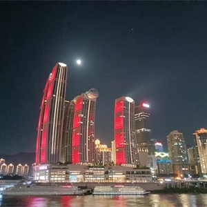 最别致的当属重庆网红景点洪崖洞了,特有的吊脚楼式建筑错落有致,被灯光映衬的金灿灿的。灯光映照在嘉陵江上时,仿佛也为江水镀上了一层金。重庆的地标性建筑——来福士也毫不逊色,楼顶的灯光像跳动的音符一般,时而快、时而慢;时而急、时而缓。朦胧中,不时有归巢的鸟儿从楼顶飞过,霎时,绚丽的灯光给它涂上了多彩的色泽。