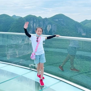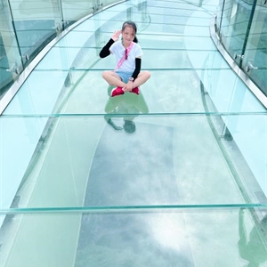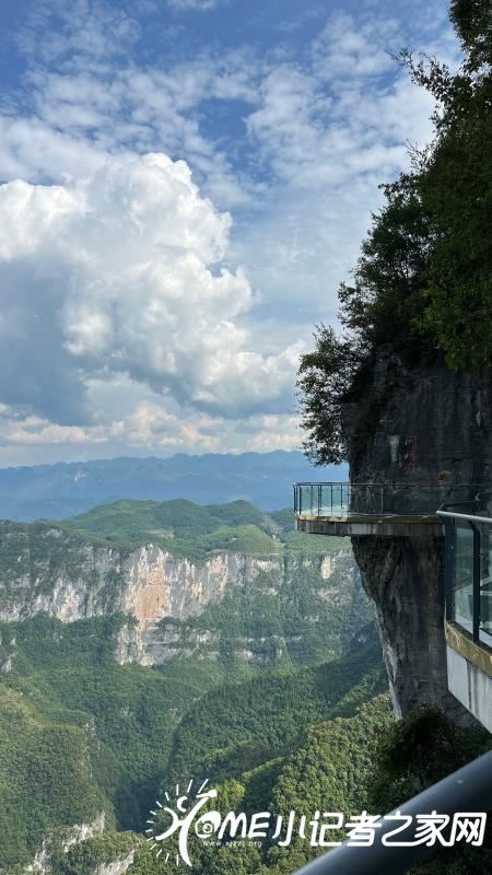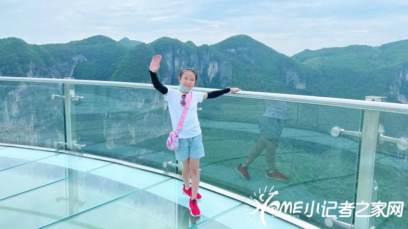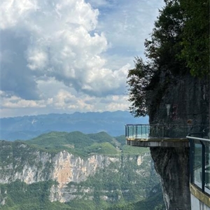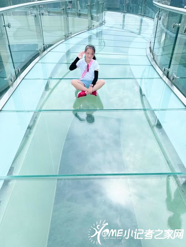 站在云端廊桥下面再往上一看,云端廊桥高耸入云,雄伟壮观。你继续往上走就到了廊桥上面,廊桥面全是玻璃制造而成,不过你不用担心它不稳,它可是用三层钢化玻璃做的,很安全的。你刚上去时可能有点怕,但你在上面多走几部就不怕了。廊桥周围的风景美不胜收,蓝蓝的天空飘着朵朵白云,下面有条绿油油的小河仿佛被周围的大树,小草染过色一样。大山深处偶有几户人家,就像几个白色的小点,零零散散的,果真是“白云深处有人家”。