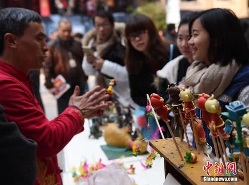 2月18日,糖画、棉花糖、龙须酥、糖糍粑、打麻糖等老重庆的舌尖记忆一一亮相重庆“十八梯?老重庆”文化节。现场,不仅有童年时期的小食供市民品尝找回忆,还有面人、糖人、蜀绣等非物质文化遗产传人现场展示技艺。图为非遗传人用做糯米和食用色素手捏而成的“吃火锅”场景图吸引市民拍照留念。