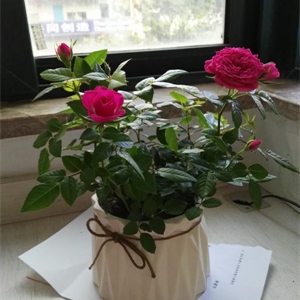 仔细打量这盆月季,它长得生机勃勃。叶子小小的,叶边缘长着锋利的小锯齿,在阳光下闪着绿油油的光。再看它那细小的茎上还长了一些小刺,不大却很尖锐,这就是月季花的自我保护。最美的要数它的花了,有的刚长出花骨朵,有的含苞待放,还有的已完全绽放,流芳吐艳。月季花娇柔艳丽,给寒冷、单调的冬季增添了一抹靓丽的色彩。