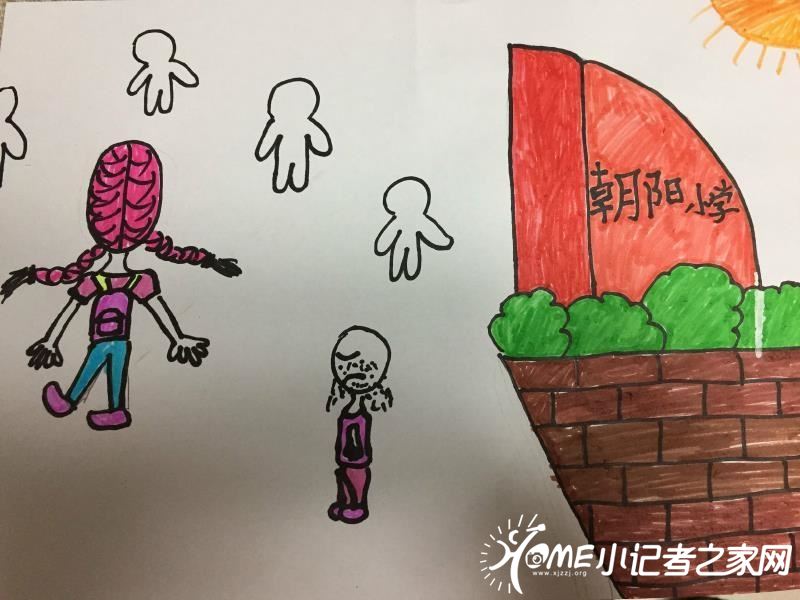 一路上三人有说有笑,弟弟像跟屁虫似的紧跟着姐姐。快到校门口时,姐姐亲切地跟弟弟亲吻后说再见,弟弟一下意识到要和姐姐分手了,立马甩开妈妈的手,哭喊着向姐姐追去,姐姐一溜烟地跑进了校门。弟弟跑了会儿,看见追不上了,就站在校门口,用那失落的眼神望着姐姐远去的背影,并不停地抽泣着。我猜他肯定在想:我要快快长大,要和姐姐一起上学。(朝阳小学南校区 刘子楠)
