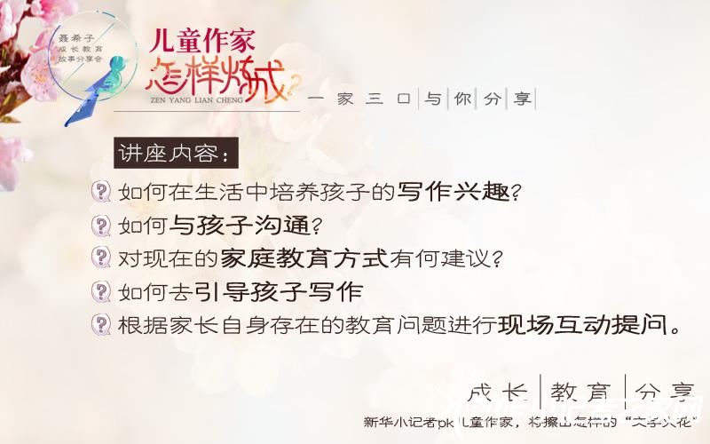 731日,新华小记者重庆组委会邀请到了12岁儿童作家聂希子一家三口,来讲一讲如何做好写作这件小事。通过聂希子一家三人对成长教育的故事分享,为各位家长在家庭教育的方式、方法上提供经验借鉴。帮助家长转变教育观念,提升家庭教育水平,引导家长以积极的心态去面对孩子在写作过程中的各类问题。