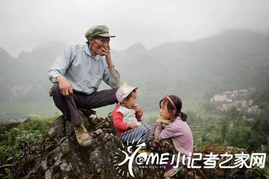 60岁的罗再强带着两个孙女坐在村口的山头,爷孙相依为命是留守村常见的现象。因为很少有交流,他们经常像这样静静地待着。视觉中国供图(资料图片)