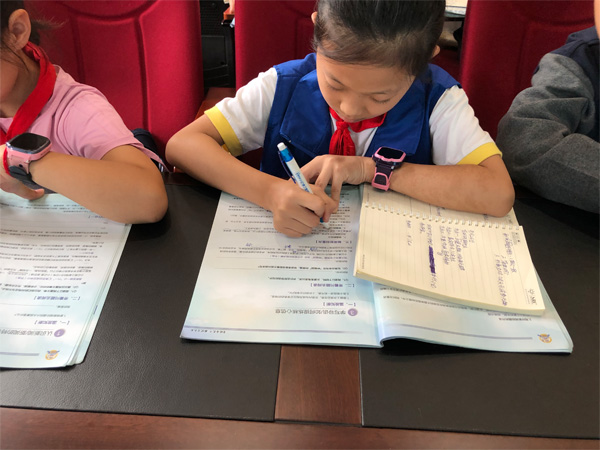 小记者在课上认真做笔记。
