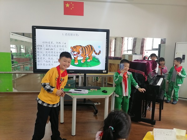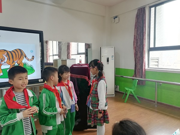 课堂主体:在课堂上小记者们通过老师设立的公园里老虎逃出笼子的情景故事,进行了角色扮演。小记者们在情景扮演中积极参与,认真扮演。把老虎逃出笼子后的大摇大摆,游客的惊慌受怕,警察的勇敢无畏表现得淋漓尽致,部分小记者还通过自己加戏的方式把故事演绎得更加鲜活有趣。随后,记者对在场人员进行采访,了解事情真相。小记者们通过初步模拟体验了记者采访情景,对记者这一职业有了更深的了解。