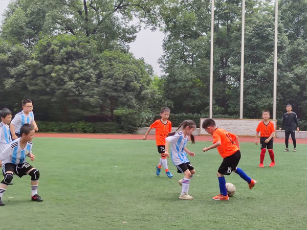 为锻炼学生身体素质,培养团队合作精神,5月28日,北大资源•鲤鱼池小学举行第三届“校园杯”班级足球赛,二年级(1)班与二年级(4)班在足球场上展开激烈角逐。
