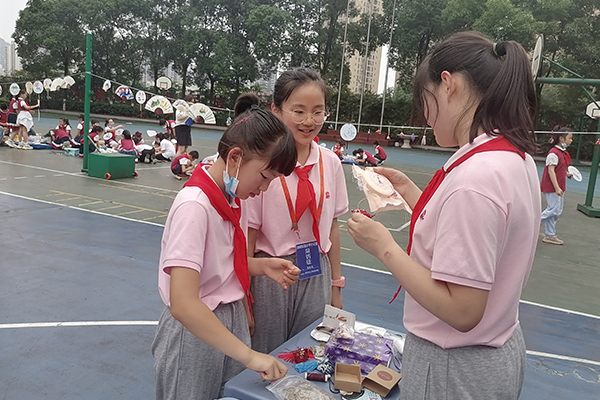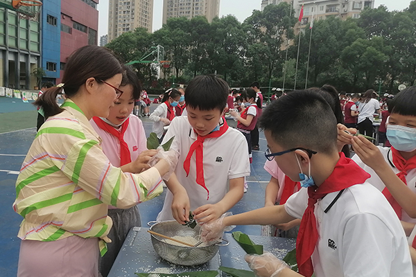 “海狮顶球”“盲人摸象”“水中夹珠”……各年级还开展了丰富多彩的趣味游园活动。四年级的同学们在操场上通过包粽子、编织五彩绳、缝制锦囊、画端午扇子等活动体验端午节传统习俗,感受中国传统文化之美。