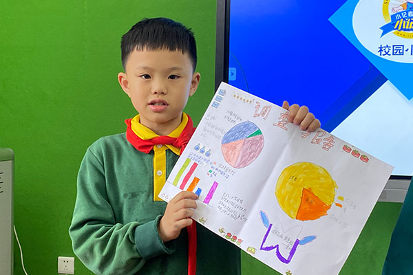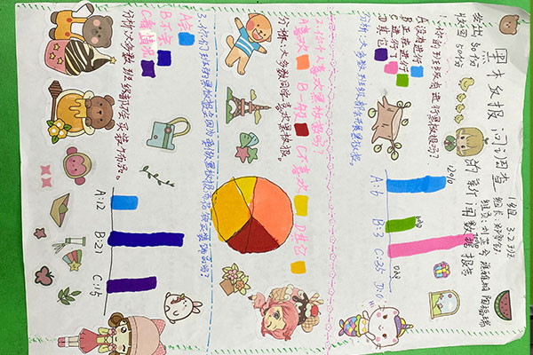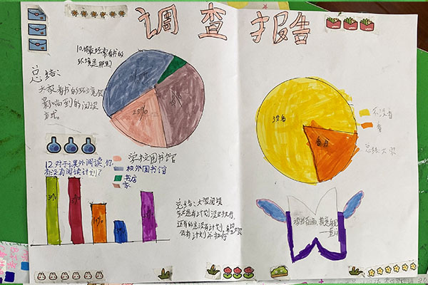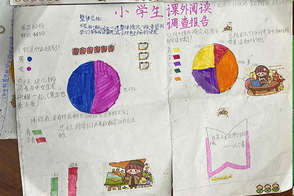 谯雅桐小组是以班级的黑板报为主题进行了调查、数据分析,覃丁月小组则是了解到了同学们爱看的课外书籍、大家的阅读时间及阅读习惯,张丽薇小组则是对校园环境进行了调查,同学们也提出了许多建议。