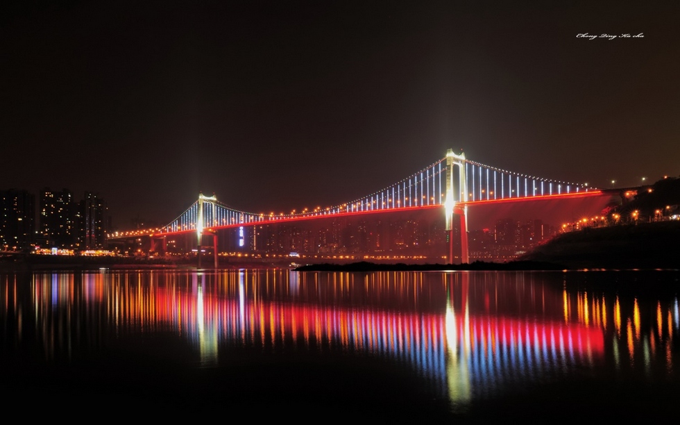 晚上,长长的鹅公岩大桥就变成了一道亮丽的风景线,桥上闪烁着五颜六色的霓虹灯,向人们展示着夜晚的别样风采。在桥上欣赏长江两岸,真是山水如画啊!