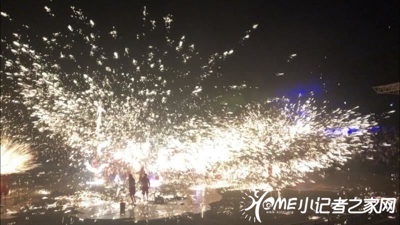 二龙戏珠真是精彩,可我最好奇的还是今晚的压轴的节目——火龙表演。表演开始,现场的灯光都熄灭了,一首激昂的音乐响起,闯进我们的耳膜和心脏。十几道光束忽然亮起,只见一条背上喷着火花的龙冲了出来,它全身通红,穿梭于一道道光束之中,怒吼着,咆哮着。洒铁水的人们早就跃跃欲试,他们两两配合,其中一个将烧得通红的铁块儿抛向夜空,另一个则挥动大铁铲向抛出的铁块击打过去。顿时,烧红的铁块被击碎,四散飞舞着,犹如绽放的花树,花瓣纷纷落下,有些竟然落向观众席,大家一阵恐慌,不想那花瓣落下来时竟然已经熄灭,恐慌变成了惊讶。此时此刻,观众们的兴奋不亚于演员的认真,演员的认真也不逊色于观众们的激动。演员们更来劲儿了,一个个充满活力,把这条龙舞得千姿百态,观众们的欢呼声此起彼伏,震耳欲聋。这条火红的龙在火海中尽情的畅游,得到了无数观众的喝彩。