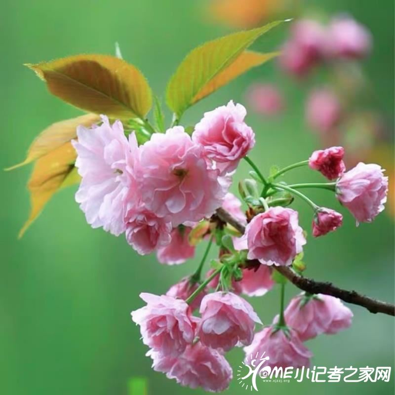 走近细看,樱花的花瓣像一片片粉色的羽毛。盛开的樱花每朵都有五六片花瓣。有的只展开了两三片花瓣,嫩黄色的花蕊悄悄地探出头来。有的花瓣全展开了,露出了开心的笑脸。有的还是花骨朵儿,含苞待放,像极了害羞的小姑娘。樱花的每个花梗都会结出三四朵樱花,花梗上的樱花们你挤我碰,争奇斗艳,美丽极了!
