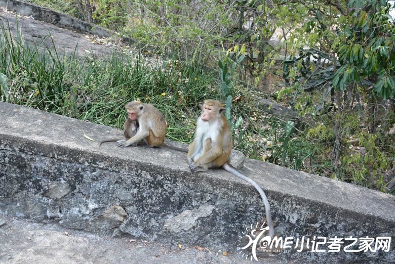 第四天一早,我们乘车去丹布勒,参观石窟金寺。在上山的路上,有好多猴子在树上跳来跳去。这里的猴子个头不大,尾巴很长,耳朵又黑又尖,头上还长着一撮毛,好可爱!一位阿姨给了小猴子一瓶水,它却怎么也打不开,我们给它做了很多示范,小猴子弄来弄去也没喝上水,它滑稽的动作却把大家逗得哈哈大笑。