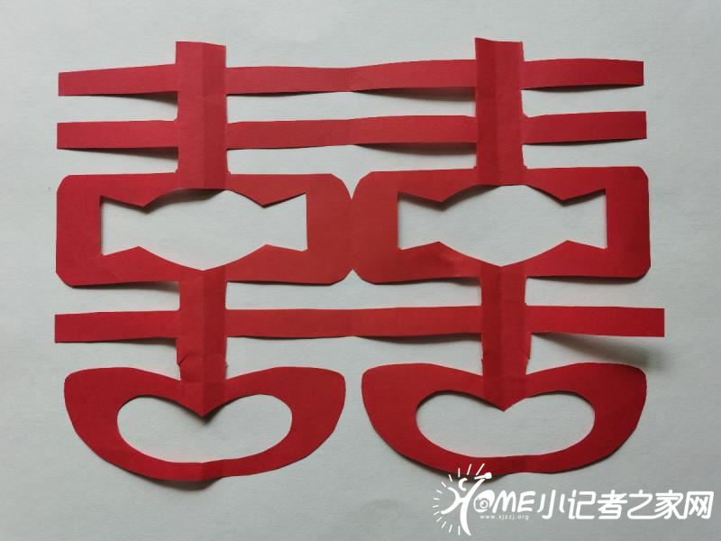 在课上,温老师主要讲的是剪双喜,她首先给同学们讲了一则小故事:很久以前,王安石去赶考途中,途经马家镇时见到一大户人家挂了一盏走马灯,灯上有半幅对子:“走马灯,灯马走,灯息马停步”,王安石觉得很有意思。没想到,到了考场上考官指着厅前的飞虎旗说:“飞虎旗,旗虎飞,旗卷虎身藏。”王安石脑中立刻浮现出马员外家走马灯上的那半幅对子,不假思索地答道:“走马灯,灯马走,灯息马停步。”他对得又快又好,令主考官赞叹不已。等回到马家镇王安石再次移花接木,随手写道:“飞虎旗,旗虎飞,旗卷虎身藏。”员外见他对得又巧妙又工整,马上把女儿许给他,并主动提出择吉日在马府完婚。原来,走马灯上的对子,乃是马小姐为选女婿而出的。结婚那天,马府上上下下喜气洋洋。正当新郎新娘拜天地时,有报子来报:“王大人金榜题名,明日请赴琼林宴!”真是喜上加喜!面对双喜临门,王安石带着三分醉意,挥毫在红纸上写了一个大“囍”字,让人贴在门上,并随口吟道:“巧对联成双喜歌,马灯飞虎结丝罗。”