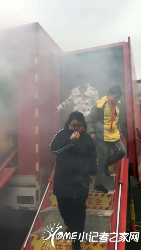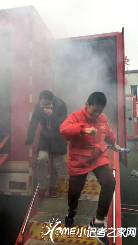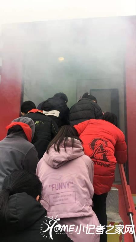 最后,高年级同学到消防车上模拟火场逃生。开始时,消防车上有一层浓浓的烟雾,同学们都按照消防官兵的要求捂住了口鼻,匍匐着上了车。