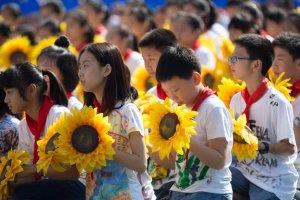 他们在毕业墙上签字留影留念,他们在母校的而立之年别离,他们互相拥抱,互相跳跃,他们即将进入更高的学府,收获更精彩的人生。活动中最令人振憾的是上千名师生,穿着手绘的T恤组成的方阵,时而是数学30,时而变化成三十,时而高举着太阳花,时而抛洒着彩色的纸条,队形整齐,变化多端,场面壮观。