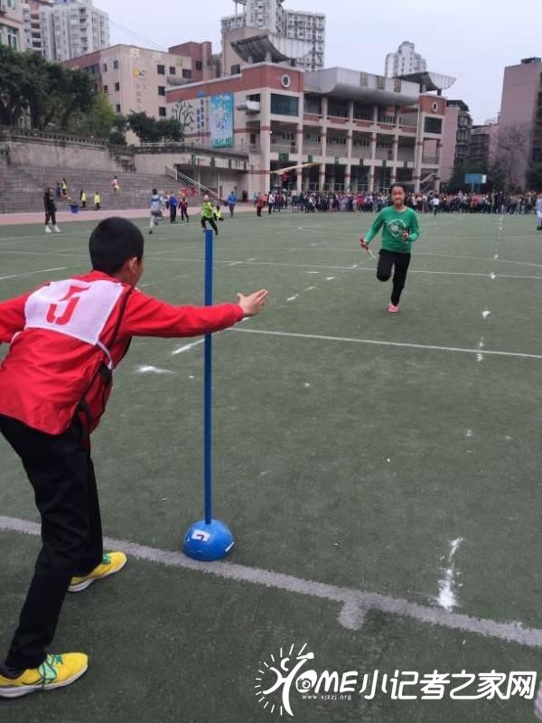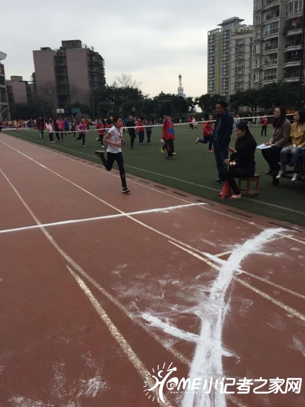 在比赛场上,优乐美中队的800米参赛者朱佳怡同学正极速地奔跑着。旁边,同学们的加油声、呐喊声“惊天动地”!终于,她成功击败对手,冲过终点线。